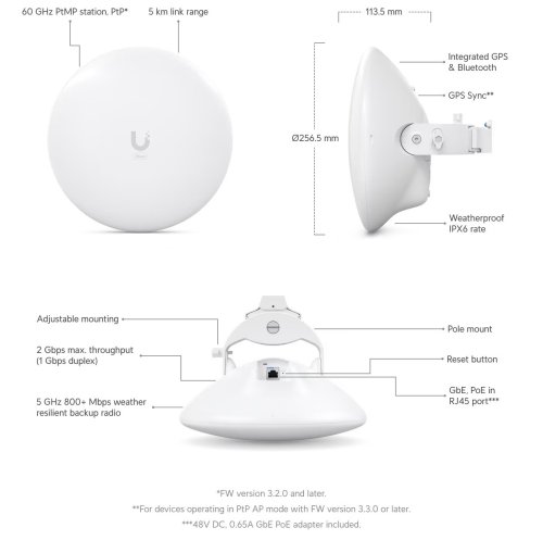 Může se připojit k Wave AP a poskytovat celkovou propustnost 2Gbps (1Gbps duplex). Wave Nano je vybaven vysoce výkonným 5GHz záložním pásmem, které zajišťuje nepřerušované připojení, a Bluetooth pro zjednodušení nastavení prostřednictvím aplikace UISP® Mobile.