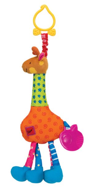 Žirafa k zavěšení na kočárek nebo nad postýlku upoutává vizuální, hmatové i sluchové smysly dítěte. Žirafa je ušita z různých materiálů a při pohmatu šustí.
