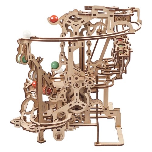 Skotačením kupředu! Stavebnice kuličkové dráhy z překližky. Ručně poháněný mechanismus zakládající se na řetězovém převodu uvádí do pohybu rej barevných kuliček i jejich překážky. Díky otevřené konstrukci je možno mechaniku detailně obbdivovat. Dráha je členěna do tří různých úseků, každého s jedinečnou hlavní překážkou. Největším lákadlem dráhy je ovšem možnost spojit dvě, nebo rovnou čtyři hotové modely dohromady, a vytvořit tak opravdu velkolepou, mechanicky propojenou sestavu. S přáteli a sourozenci také vybavenými touto hračkou můžete tímto způsobem zábavu násobit. Zkrátka ale nepříjdete ani s jedním modelem, můžete se ve skupině vsázet a favorizovat svou kuličku jako nejrychlejší. Vybaveno detailním návodem k sestavení. Hlavní vlastnosti:dráha a 10 kuliček 3 barev400 precizně vyřezaných dílkůvysoká obtížnost sestavenímožnost napojení dalších drahnavrženo a vyrobeno na Ukrajině