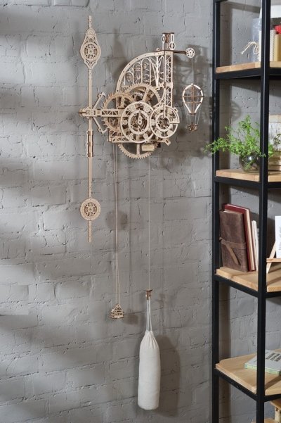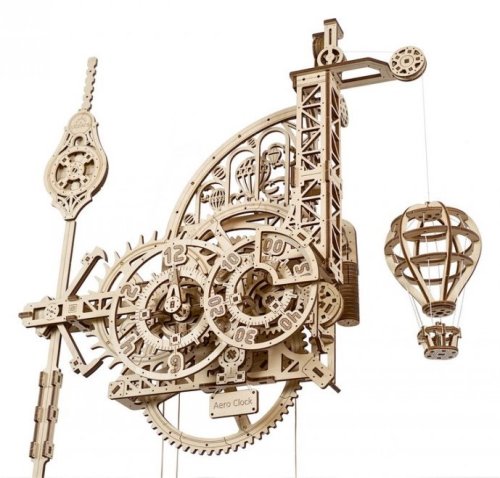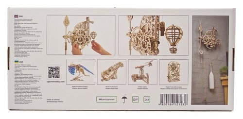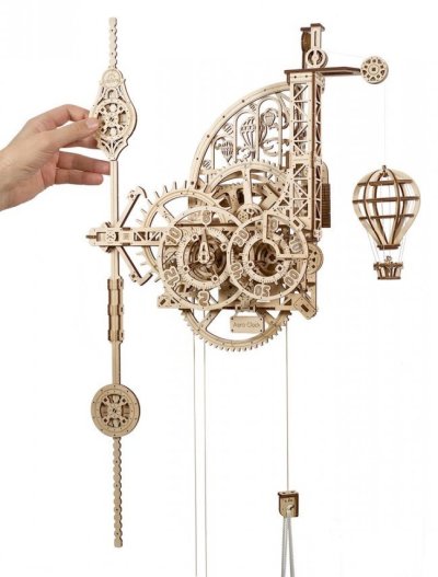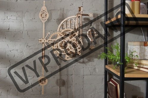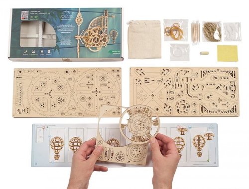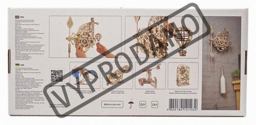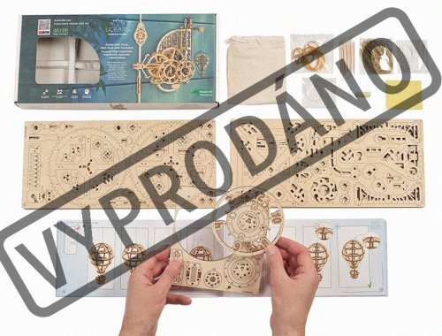 Nadešel čas! Stavebnice nástěnných hodin vyrobená z překližky. Sledujte práci gravitace v součinnosti s odhaleným hodinovým strojkem. Uchvátí Vás zpracováním kyvadla a krokového mechanismu. Hodiny mají pevné ručičky, čas se odečítá z dvojice ciferníků otáčejících se proti směru hodinových ručiček, což prohlubuje výjimečný zážitek z jejich sledování. Zavěšený model horkovzdušného balónu pravidelně v průběhu času pomalu stoupá a každou celou hodinu oznamuje poklesnutím. Design modelu, inspirovaný průmyslovou revolucí a průkopnictvím letectví, osloví nejen technické, ale i romantické povahy. Hodiny jsou vybaveny mechanismem ladění rovnovážné polohy. Natahování je zajištěno hlavním závažím, plátěným sáčkem (součást balení), do nějž se nasype písek, či sůl. Jemné ladění mechanismu se provádí pomocí závaží na kyvadlech a pomocí dalšího závaží lze regulovat i rychlost poklesu modelu horkovzdušného balónu. Nastavení ciferníků a přesného času se provádí s pomocí mechanické západky. Vybaveno detailním návodem k sestavení. Hlavní vlastnosti: 320 precizně vyřezaných dílkůvysoká obtížnost sestaveníoznamování celé hodinyširoké možnosti ladění navrženo a vyrobeno na Ukrajině