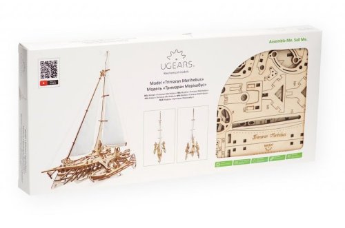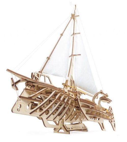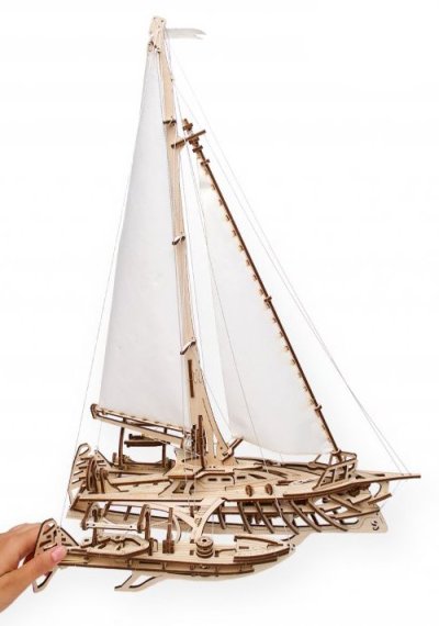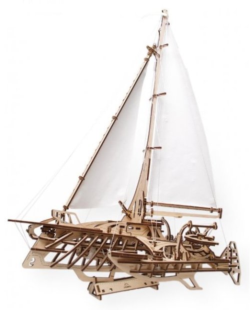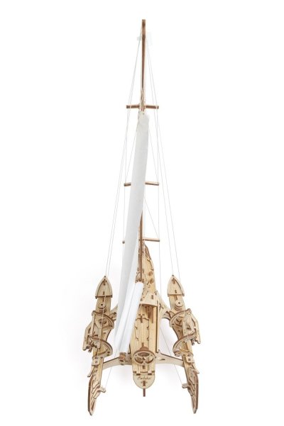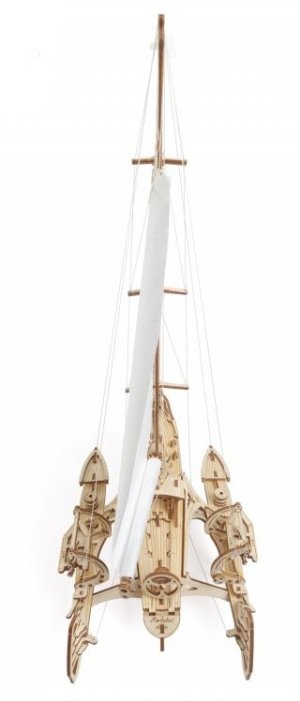 S větrem v zádech. Stavebnice trimaránové plachetnice vyrobená z překližky. Vyznavači štíhlých tvarů ocení překvapivě věrnou, propracovanou konstrukci přetékající detaily, kterou korunují zářivě bílé kosé plachty. Model oplývá mimořádným množstvím mechanických detailů, ať už jde o kormidlo, ovládání ráhen a naviják, s jehož pomocí vztyčíte vlajku o vlastním dekoru, nebo detail člunových jeřábů. Plachetnice je díky konstrukci na rovné ploše bezpečně stabilní, součástí balení je ovšem i zdobený stojan. Vybaveno detailním návodem k sestavení. Hlavní vlastnosti: 237 precizně vyřezaných dílkůvysoká obtížnost sestavenísvinutelné plachtovívelké množství dalších mechanických detailůšablony pro dekorování vlajkynavrženo a vyrobeno na Ukrajině