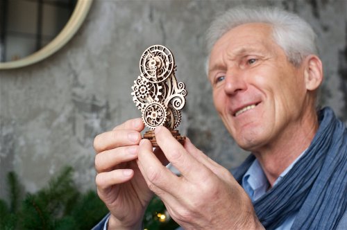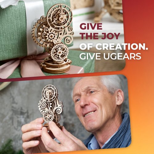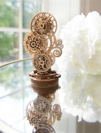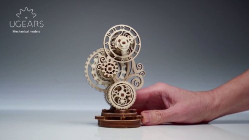Retrofuturisticky! Stavebnice okrasné imitace hodin vyrobená z překližky. Hodiny mají hodinovou i minutovou ručičku a jejich asynchronní mechanika je propracovaná i nápaditě odhalená, abyste mohli celé soukolí sledovat. Pozornost upoutá také 90° převod u základny modelu. Potěší i ozdobnými prvky spojujícími přírodní a mechanické motivy. Pro všechny, kdo přemýšlí, jak vstoupit do světa mechaniky UGEARS, nebo hledají drobný dárek pro zvědavce, kteří s jeho pomocí mohou mladší naučit rozpoznávat hodiny. Vybaveno detailním návodem k sestavení. Hlavní vlastnosti: 43 precizně vyřezaných dílkůnízká obtížnost sestaveníreálný převod minuty/hodinynavrženo a vyrobeno na Ukrajině