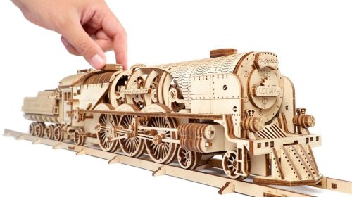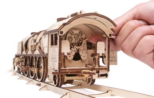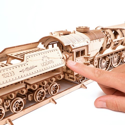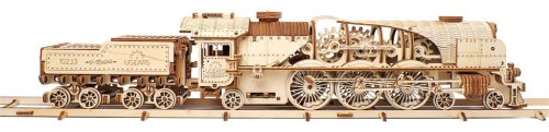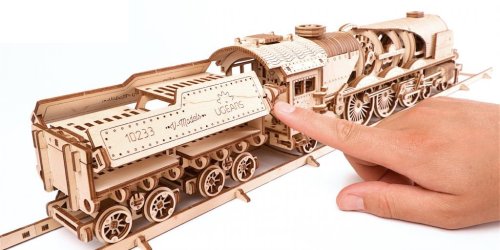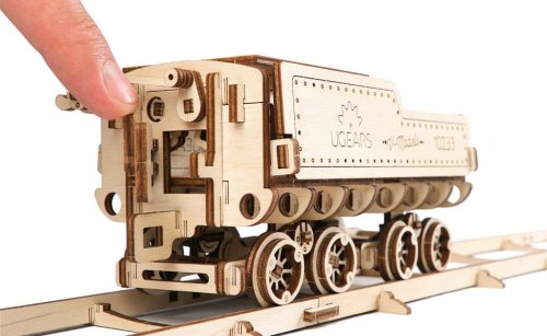 Plnou parou průmyslovou revolucí. Stavebnice parní lokomotivy s tendrem vyrobená z překližky. Tendr má odklápěcí boky a nabízí úložný prostor i pro případ, že model bude stát ve vitríně. Mechanika je do detailu propracovaná, vy tak můžete pozorovat pohyb klikového mechanismu dvojkolí modelu. Lokomotiva je zbavena pláště, a lze tak pozorovat i chod soukolí uvnitř. Díky natahovacímu mechanismu je model schopen jízdy, na jedno natažení urazí až 4 metry. Má funkční převodovku pro volnoběh a zpátečku. Může se pyšnit dalšími mechanickými podrobnostmi, dveřmi kabiny strojvedoucího, dvířky topeniště a střešní ventilace, nebo i spřáhlem. Lokomotiva je posazena na až 2 metry dlouhém rovném úseku tratě. Mezi nabízeným traťovým příslušenstvím naleznete model nástupiště, s nímž prohloubíte celkový zážitek ze stavby a provozu modelu. Uspořádejte závody s dalšími modely UGEARS! Vybaveno detailním návodem k sestavení. Hlavní vlastnosti: 538 precizně vyřezaných dílkůvysoká obtížnost sestaveníúložný prostormnožství mechanických detailůrozšiřitelný o model nástupištěvýsledný model je schopný samostatné jízdy včetně zpátečkynavrženo a vyrobeno na Ukrajině