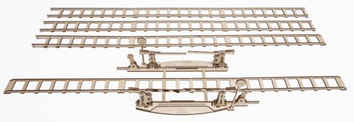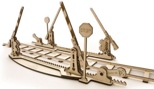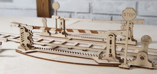 Sada dřevěných kolejí s pohyblivými závorami je skvělým doplňkem Ugears lokomotivy či vlakového nádraží. (Lokomotiva a nádraží nejsou součástí balení).