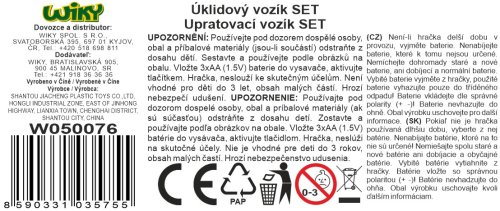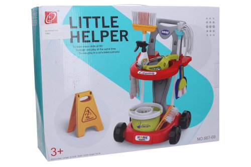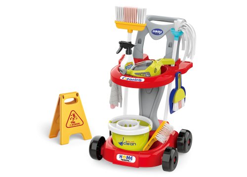 Úklidový vozík. Velikost 35x42,5x55cm. Obsahuje vozík, smětáček s lopatkou, mop, smeták, ruční vysavač, rozprašovač, kbelík, cedulku pro varování před mokrou podlahou. Návod na složení vozíku na obale. 3x AA baterie do vysavače nejsou součástí.