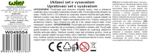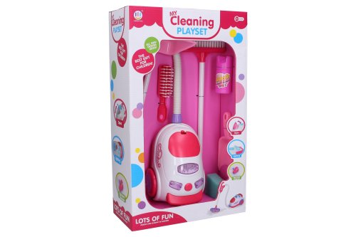 Uklízecí se s vysavačem a efekty 9ks. Obsah balení - vysavač, smeták a smetáček, malá a velká lopatka, kuličky k vysávání, sprej, houbička. Vydává světelné efekty. Baterie 3xAA, nejsou součástí. balení. Vysavač po zapnutí vypínače vysává polystyrenové kuličky. Otevřením vysavače lze kuličky vysypat.