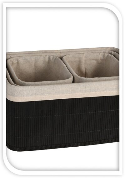 • materiál: bambus / bavlna- pevná konstrukce z bambusových lamel- přírodní materiál, který je lehký, ale přitom odolný, nepraská a má dlouhou životnost- košíky lze využít jako multifunkční úložný prostor pro skladování kosmetiky, hraček, oblečení, doplňků, šperků, potravin, atd..- jemný přírodní vzhled, který se hodí do každé místnosti- sada obsahuje 4 košíky ve třech velikostech:- 2 x malý: 20 x 15,5 x 14,5 cm- 1 x střední: 35 x 25 x 16 cm- 1 x velký: 38 x 27 x 18 cm- barva košíku: černá