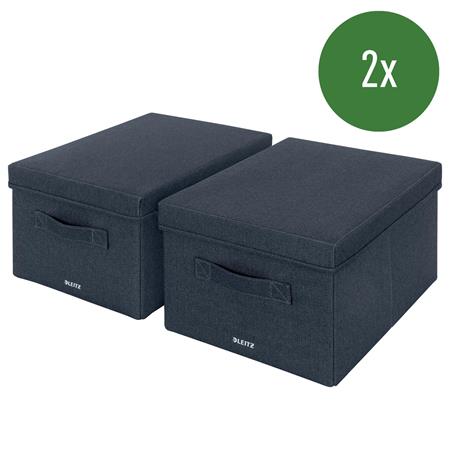 "S moderními designovými výrobky Leitz se můžete cítit pohodlně, ať už vás den zavede kamkoli. Minimalistický design a decentní matně šedé sametové provedení oceníte v kanceláři, doma i kdekoli jinde. Látkové úložné boxy Leitz s víkem jsou ideální pro ukládání dokumentů formátu A4, tabletů, sluchátek a dalších kancelářských potřeb, aby byly uklizené a zároveň po ruce. V domácnosti lze látkové úložné tašky použít k ukládání např. hraček nebo knih v policích ve skříních. Vyrobeno z měkkého materiálu, který je vyztužen recyklovanou lepenkou pro větší pevnost a odolnost. Materiálové složení tvoří z 57 % recyklovaný obsah. Látková taška je skládací, když ji nepoužíváte, můžete ji snadno uložit a ušetřit místo. Tyto středně velké úložné boxy s držadly jsou dokonalým doplňkem do vaší domácnosti nebo kanceláře, který vám zajistí pohodu a produktivitu po celý den.