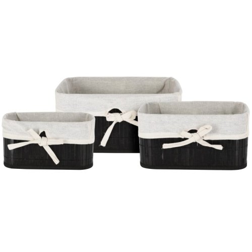 • materiál: bambus / bavlna- pevná konstrukce z bambusových lamel- přírodní materiál, který je lehký, ale přitom odolný, nepraská a má dlouhou životnost- košíky lze využít jako multifunkční úložný prostor pro skladování kosmetiky, hraček, oblečení, doplňků, šperků, potravin, atd..- jemný přírodní vzhled, který se hodí do každé místnosti- sada obsahuje 3 košíky ve třech velikostech:- malý: 24 x 14 x 12 cm- střední: 29 x 19 x 14 cm- velký: 34 x 24 x 16 cm- barva košíku: černá