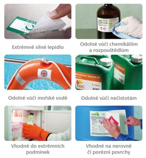 • Silná přilnavost etiket k různým povrchům, odolnost vůči mořské vodě, mastnotě, špíně, UV záření a teplotám mezi -40°C a + 150°C