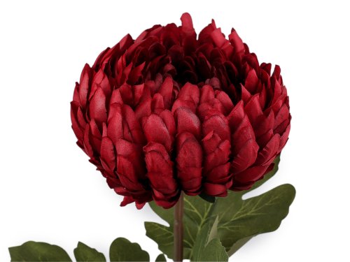 Umělá chryzantéma se pyšní svou velikostí. Květ a listy jsou textilní. Uvnitř stonku je drát. Chryzantémy vyniknou v jednoduché váze, ale také je využijete k aranžování květinových vazeb, věnců i ikeban.