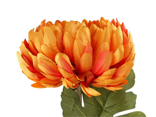 Umělá chryzantéma se pyšní svou velikostí. Květ a listy jsou textilní. Uvnitř stonku je drát. Chryzantémy vyniknou v jednoduché váze, ale také je využijete k aranžování květinových vazeb, věnců i ikeban.