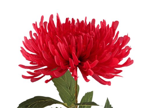 Umělá chryzantéma se pyšní svou velikostí. Květ a listy jsou textilní. Uvnitř stonku je drát. Chryzantémy vyniknou v jednoduché váze, ale také je využijete k aranžování květinových vazeb, věnců i ikeban.