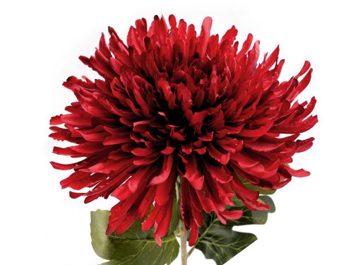 Umělá chryzantéma se pyšní svou velikostí. Květ a listy jsou textilní. Uvnitř stonku je drát. Chryzantémy vyniknou v jednoduché váze, ale také je využijete k aranžování květinových vazeb, věnců i ikeban.