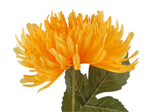 Umělá chryzantéma se pyšní svou velikostí. Květ a listy jsou textilní. Uvnitř stonku je drát. Chryzantémy vyniknou v jednoduché váze, ale také je využijete k aranžování květinových vazeb, věnců i ikeban.