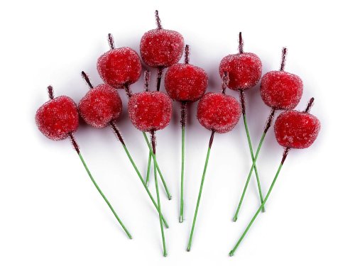 Malá dekorační jablíčka jsou zahalené drobnými transparentními kuličkami, které vytvářejí dojem námrazy. Díky připevněnému drátku se lehce tvarují. Jablíčka využijete na výrobu podzimních a zimních vazeb, věnců, ikeban apod.
