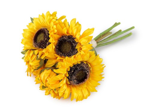 Svazek umělých slunečnic vynikne ve váze, v květinových vazbách, podzimních aranžmá a jednotlivé stonky s květy můžete zakomponovat i do dekoračních věnců.