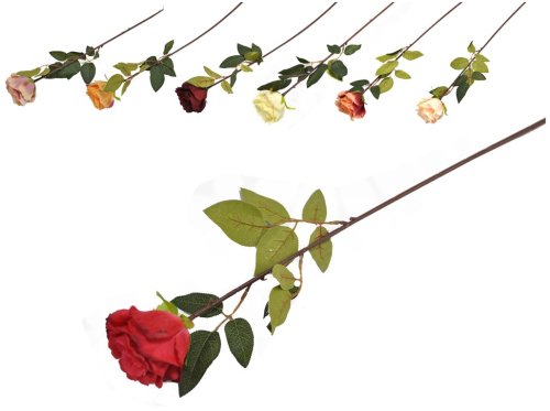 Umělá růže vyrobená z plastu o délce 740 mm, dodávaná v mixu barev. Jednotlivé kusy se mohou lišit odstínem i detailem zpracování, což dodává květině přirozený vzhled.