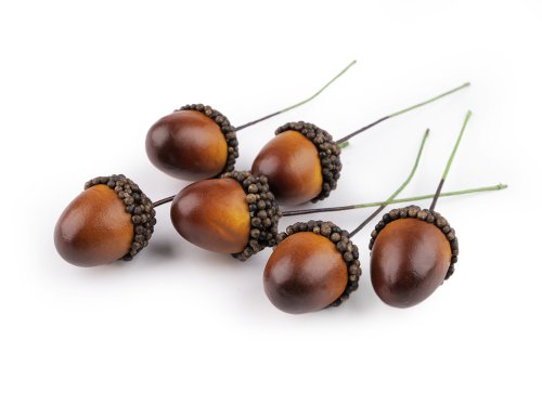 Dekorační umělý žalud je připevněný na drátě, takže ho můžete libovolně tvarovat. Plody žaludu vyniknou v podzimních vazbách, věncích, truhlících apod.