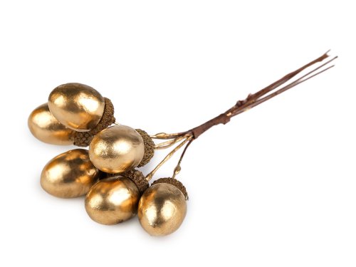 Metalické žaludy jsou vyrobené z polystyrenu, kalíšek je přírodní. Díky drátku je manipulace s nimi jednoduchá a umožňuje snadné zakomponování do jakékoliv dekorace. Žaludy vyniknou v podzimních vazbách, věncích, na svícnech apod.