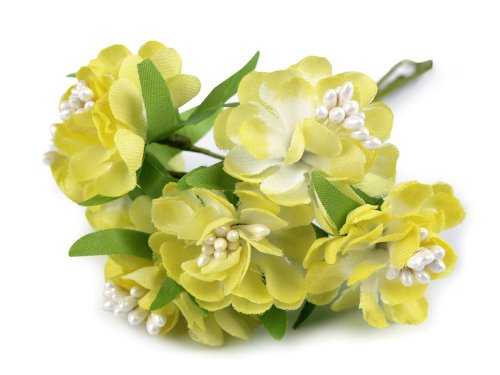 Textilní květy skvěle dozdobí vaše květinové dekorace a aranžmá. Jsou detailně propracované a ozdobené drobnými pestíky. Jednotlivé květy jsou připevněné k ohebnému drátku omotaném floristickou páskou, který umožňuje snadnou manipulaci a lehkou tvarovatelnost. Použití: Květy využijete při výrobě svatebních dekorací nebo k ozdobení čelenek do vlasů, věnců, apod. 6 kusů květů je spojeno do svazku.