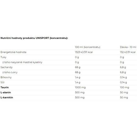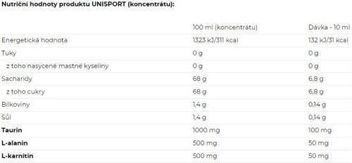Tekutý koncentrát pro přípravu hypotonického sportovního nápoje, s obsahem L-karnitinu, L-alaninu a taurinu. Nápoj je lehce mineralizovaný, umožňuje tedy kvalitní doplňování pitného režimu kdykoli během dne. Je vhodný před fyzickou aktivitou, během ní i po jejím skončení. - hypotonický nápoj - až 70 litrů nápoje z 1 litru koncentrátu - 7 g sacharidů v jedné dávce - L-karnitin - L-alanin - taurin - tekutý koncentrát - Nutriční hodnoty viz obrázky Doporučené dávkování: 10 ml koncentrátu do 600 - 700 ml vody. Maximálně 50 ml koncentrátu za den. Pro přípravu nepoužívejte minerální vody z důvodu narušení osmolality nápoje a minerální rovnováhy. Nepřekračujte doporučené dávkování. Použití: pro přesnou přípravu nápoje použít přiloženou odměrku. Hotový nápoj nikdy neskladovat déle než 24 hodin. Po otevření uchovávat při teplotě do 25 °C a spotřebovat do 3 měsíců. Složení: Příchuť lesní jahoda: cukr, voda, regulátor kyselosti kyselina citronová, aroma, chlorid sodný, glukonát hořečnatý, taurin, L-karnitin, L-alanin, sladidlo acesulfam K, fosforečnan monodraselný, sladidlo sukralóza, barvivo E-122 – může nepříznivě ovlivňovat činnost a pozornost dětí, konzervanty sorban draselný a benzoan sodný. Příchuť ananas: cukr, voda, emulze ananas (aroma, barviva E-102 a E-110 - mohou nepříznivě ovlivňovat činnost a pozornost dětí), regulátor kyselosti kyselina citronová, chlorid sodný, glukonát hořečnatý, taurin, L-karnitin, L-alanin, sladidlo acesulfam K, fosforečnan monodraselný, sladidlo sukralóza, konzervanty sorban draselný a benzoan sodný. Příchuť citron: cukr, voda, emulze citron (slunečnicový olej, aroma, barvivo E-161b), regulátor kyselosti kyselina citronová, chlorid sodný, glukonát hořečnatý, taurin, L-karnitin, L-alanin, sladidlo acesulfam K, fosforečnan monodraselný, sladidlo sukralóza, konzervanty sorban draselný a benzoan sodný. Příchuť pomeranč: cukr, voda, regulátor kyselosti kyselina citronová, emulze pomeranč (slunečnicový olej, aroma, barviva E-160a, E-160e, E-161b), chlorid sodný, glukonát hořečnatý, taurin, L-karnitin, L-alanin, sladidlo acesulfam K, fosforečnan monodraselný, sladidlo sukralóza, konzervanty sorban draselný a benzoan sodný. Příchuť broskev + maracuja: cukr, voda, regulátor kyselosti kyselina citronová, chlorid sodný, glukonát hořečnatý, taurin, aroma, L-karnitin, L-alanin, sladidlo acesulfam K, fosforečnan monodraselný, sladidlo sukralóza, konzervanty sorban draselný a benzoan sodný, barvivo E-102 – může nepříznivě ovlivňovat činnost a pozornost dětí. Příchuť pink grep: cukr, voda, regulátor kyselosti kyselina citronová, emulze růžový grep (aroma, barviva E-124 a E-110 – mohou nepříznivě ovlivňovat činnost a pozornost dětí), chlorid sodný, glukonát hořečnatý, taurin, L-karnitin, L-alanin, sladidlo acesulfam K, fosforečnan monodraselný, sladidlo sukralóza, aroma naringin, konzervanty sorban draselný a benzoan sodný. Příchuť malina + brusinka: cukr, voda, regulátor kyselosti kyselina citronová, aroma, chlorid sodný, glukonát hořečnatý, taurin, L-karnitin, L-alanin, sladidlo acesulfam K, fosforečnan monodraselný, sladidlo sukralóza, konzervanty sorban draselný a benzoan sodný, barvivo E-122 – může nepříznivě ovlivňovat činnost a pozornost dětí. Příchuť černý rybíz: cukr, voda, regulátor kyselosti kyselina citronová, emulze černý rybíz (aroma, barviva E 122- může nepříznivě ovlivňovat činnost a pozornost dětí a E 133), chlorid sodný, glukonát hořečnatý, taurin, L-karnitin, L-alanin, sladidlo acesulfam K, fosforečnan monodraselný, sladidlo sukralóza, konzervanty sorban draselný a benzoan sodný. Příchuť cherry: cukr, voda, regulátor kyselosti kyselina citronová, aroma, chlorid sodný, glukonát hořečnatý, taurin, L-karnitin, L-alanin, sladidlo acesulfam K, fosforečnan monodraselný, sladidlo sukralóza, barvivo E-122 – může nepříznivě ovlivňovat činnost a pozornost dětí, konzervanty sorban draselný a benzoan sodný. Příchuť mojito: cukr, voda, regulátor kyselosti kyselina citronová, aroma, chlorid sodný, glukonát hořečnatý, taurin, L-karnitin, L-alanin, sladidlo acesulfam K, fosforečnan monodraselný, sladidlo sukralóza, konzervanty sorban draselný a benzoan sodný, barviva E-104 – může nepříznivě ovlivňovat činnost a pozornost dětí a E-133. Upozornění: Koncentrát k přípravě ochuceného nealkoholického obohaceného nápoje, s cukrem a sladidly. Nenahrazuje pestrou stravu. Není určeno pro děti a těhotné nebo kojící ženy. Ukládejte mimo dosah dětí! Výrobce neručí za případné škody vzniklé nevhodným použitím nebo skladováním. Skladujte v suchu při teplotě do 25 °C mimo dosah přímého slunečního záření, chraňte před mrazem. Dodavatel: NUTREND D.S., a.s., Chválkovice 604, 779 00 Olomouc, Česká republika
