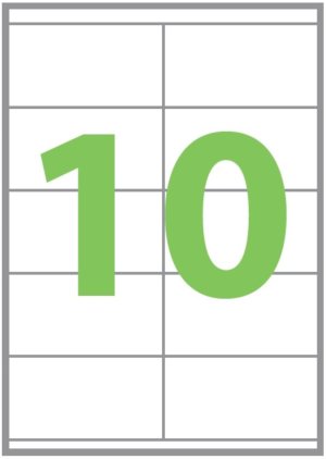 Klasické samolepicí etikety vhodné pro laserové tiskárny, inkoustové tiskárny a kopírky Velikost štítku: 105 x 57 mm Počet štítků na list: 10 Šířka okraje (nahoře a dole): 5,2 mm Gramáž: 70 g/m2 CIE …