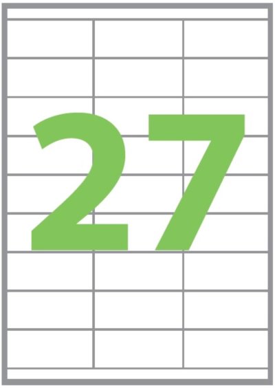 Klasické samolepicí etikety vhodné pro laserové tiskárny, inkoustové tiskárny a kopírky Velikost štítku: 70 x 30 mm Počet štítků na list: 27 Gramáž: 70 g/m2 CIE bělost: 150 QCT - Quatro Clean Technology …