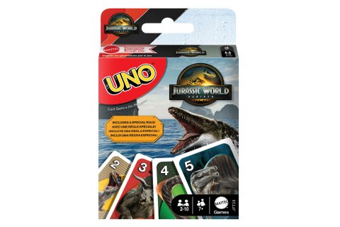 UNO Jurský svět přináší oblíbenou karetní hru v novém, dobrodružném stylu inspirovaném ikonickými obrázky z filmové série Jurský svět. Kromě klasických pravidel obsahuje i speciální kartu, která do hry přináší nový zvrat a ještě více napětí. Užijte si vzrušující partii s přáteli nebo rodinou a ponořte se do světa plného dinosaurů! Doporučený věk 7+