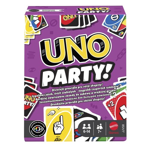 Speciální edice oblíbené karetní hry UNO, která se hraje stejně jako klasické UNO® – hledáte karty se stejnou barvou, číslem nebo symbolem. Tato verze je upravena pro větší skupiny hráčů, obsahuje více karet a přináší ještě hlasitější, bláznivější a divočejší zábavu. Nezapomeňte vykřiknout „UNO!“, když vám zbývá poslední karta. Přidává i nová pravidla pro interaktivní hru, například kartu „Ukaž na druhého“, kdy musí každý hráč ukázat na jiného – a ten si lízne kartu. UNO Party obsahuje 168 karet, což odpovídá 1,5 balíčku klasického UNO, a je ideální na každou párty nebo rodinné setkání plné smíchu.