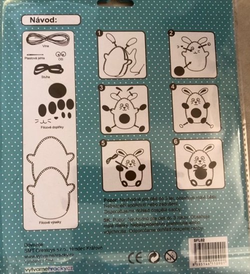 Balení obsahuje: Vlnu, oči, plastovou jehlu, stuhu, filcové doplňky, filcové výseky. Vhodné pro děti od 6 let.