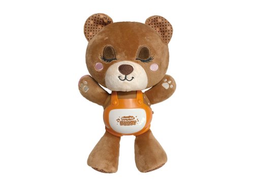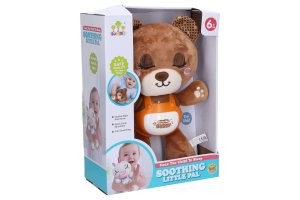 Usínáček medvěd. Velikost 29 cm. baterie 3xAAA nejsou součástí. Přepínač on/off na boku zvířátka. Stisknutím bříška se spouští zvukové efekty- 1. stisknutí ukolébavka, 2. stisknutí uklidňující hudba, 3. stisknutí chrápání, 4. stisknutí pouze světlo, 5. stisknutí vypnutí, 6. stisknutí - proměnlivý režim.
