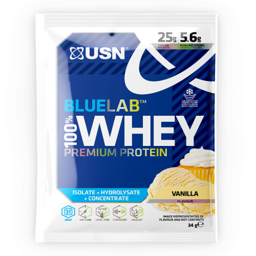 BLUELAB 100% WHEY PREMIUM PROTEIN je ultra prémiová formula bílkovinné směsi složené z nejkvalitnějšího syrovátkového proteinového koncentrátu, hydrolyzátu a isolátu s obsahem 25 g proteinu a 5,8 g BCAA v jedné dávce s maximálním využitím v trávicím traktu. Je navržen a formulován tak, aby byla zaručena nejvyšší kvalita syrovátkových proteinů. Při jeho přípravě jsou používány technologické postupy jako je např. ultrafiltrace, při kterých se používá nízká teplota pro získání extrémně kvalitních proteinů s nejlepšími vlastnostmi a nejkvalitnějšími látkami. Je používán profesionálními sportovci a sportovními týmy v celosvětovém měřítku. Tato bílkovinná směs byla navržena a vyvíjena za pomocí zpětné vazby od našich zákazníků a zaručuje optimální svalovou podporu a regeneraci, retenci dusíku, konverzi aminokyselin, nejlepší chuť a nejvyšší kvalitu proteinů. Pokud Vám záleží na kvalitě a využitelnosti produktů, které konzumujete, a nezáleží na tom, jestli jste jen sportovní nadšenec nebo profesionální sportovec, ať už trénujete pouze o víkendech nebo tvrdě cvičíte celý týden, BlueLab 100% Whey Protein Premium je tu pro Vás. Bez obsahu lepku. Doporučené dávkování:
