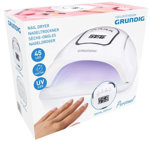 Nehty jako v salonu – sušička na nehty zajišťuje rovnoměrný a hladký povrch gelového laku na nehty, podobně jako v nehtovém studiu.Radost po celé týdny – se správnou přípravou na nehty zůstane gelový lak na nehty bez problémů krásný po celé týdny!Za minutu uschnou – díky sušení UV lampou na nehty schne vrstva gelového laku na nehty již za minutu.Krásné a pěstěné nehty během několika minut díky této UV lampě na nehty od Grundig – to je to, co chce každý, že? Zatímco běžný lak na nehty potřebuje čas na sušení na vzduchu a již po několika dnech se odlupuje, u gelových laků na nehty je to jiné. Polymery v Shellac vytvrzují pod vlivem UV světla, což není u běžného laku na nehty. Běžný Shellac na vzduchu nezasychá a k sušení vyžaduje UV světlo. Co dostanete na oplátku? Krásné nehty, které se neodlupují a při správné přípravě vydrží až 2 týdny.Specifikace Grundig UV lampa pro gelové nehtySpotřeba proudu: 12 WDélka kabelu: 115 cmDisplej: digitálníPočet nastavení: 4