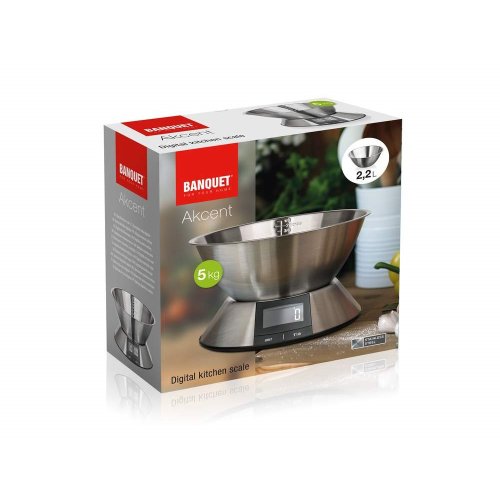 Kuchyňská digitální váha AKCENT. Mžnosti vážení: suché potraviny: g, fl. Oz, lb:oz, ml. Váha je opatřena automatickým vypnutím, možností dovažování, indikátorem slabé baterie a přetížení.