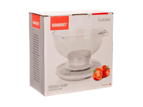 Mechanická kuchyňská váha 5 kg CULINARIA, objem mísy 2 L, materiál: plast ABS tělo (bílá barva), mísa průhledný plast. Váživost 5 kg, rozlišení 50g. Rozměr: 20 x 21 x 17 cm, hmotnost 525 g.