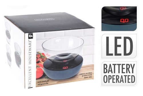 • digitální kuchyňská váha- pohodlné vážení díky prostorné míse- velký dobře čitelný LCD displej- maximální kapacita 5 kg- funkce automatického vypnutí při nečinosti- volitelné jednotky: G, OZ, ML- moderní design- napájení: 2 x AAA baterie, není součástí balení- rozměry mísy: 18 x 9 cm- objem mísy: 1,3 litru- barva základny: šedá