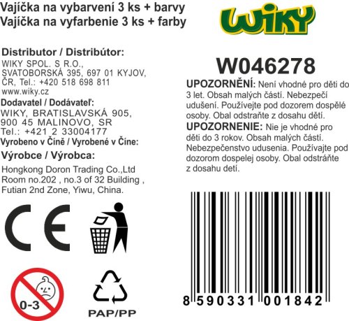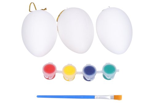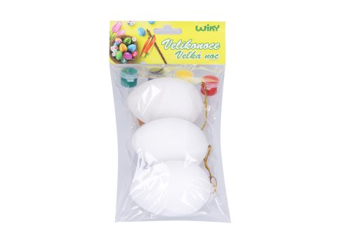 Vajíčka plastové na vybarvení o velikosti 5x8 cm 3 ks. Součástí balení barvy + štětec.