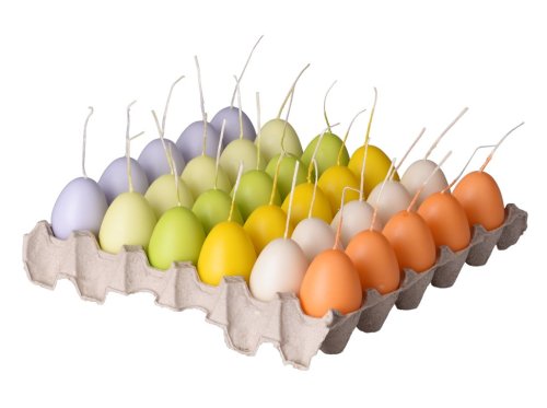Dekorativní svíčka ve tvaru vajíčka o rozměru 45×55 mm, umístěná na platě. Provedení je dodáváno v mixu, jednotlivé kusy se mohou lišit barvou nebo odstínem.
