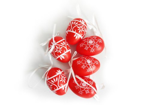 Vajíčko dekorační plastové červené o velikosti 6 cm. 6ks v organza sáčku. Cena za jeden organza sáček.