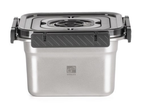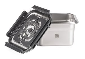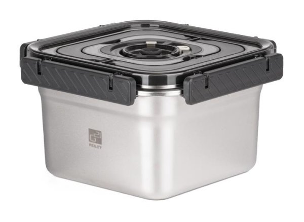 Víko z BPA Free plastu je vybavené vakuovacím ventilem a praktickým nastavitelným ukazatelem data. Budete tak vědět, kdy byly potraviny vakuovány nebo do kdy se mají spotřebovat. Pro uvolnění vakua a otevření dózy stačí jemně zmáčknout ventil uprostřed víka.