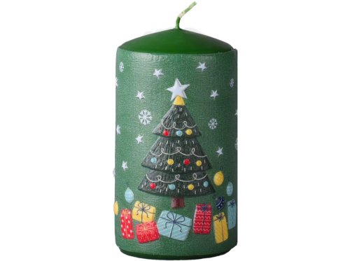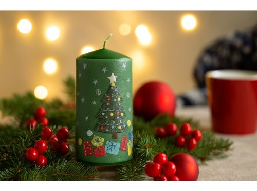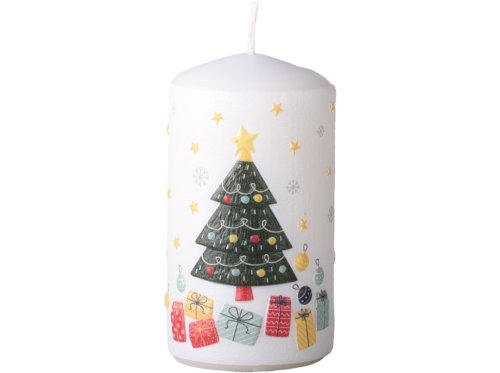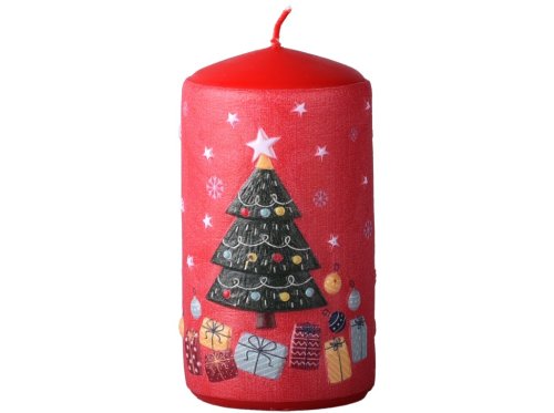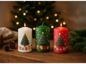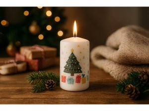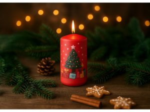 Válec o rozměru 60×110 mm s motivem stromečků a dárků je dekorativní vonná svíčka, která vnese do vašeho domova slavnostní atmosféru. Vyrobena z kvalitního vosku, poskytuje teplé světlo a stylovou dekoraci vhodnou pro stoly, adventní věnce nebo jako samostatný doplněk.