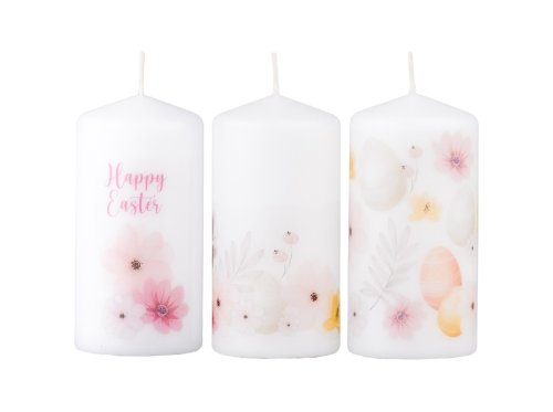 Dekorační válcová svíčka o rozměru 60×120 mm s velikonočním motivem Happy Easter II. Design je dodáván v mixu, jednotlivé svíčky se mohou lišit motivem i barevným provedením.