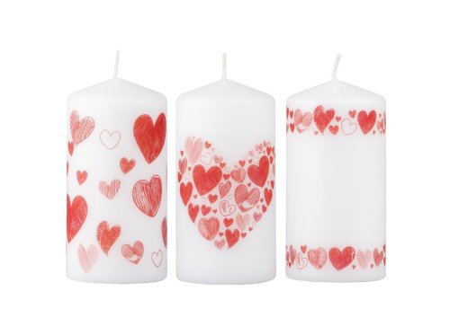 Krásná červená svíčka s motivem srdcí, ideální pro romantické chvíle.
