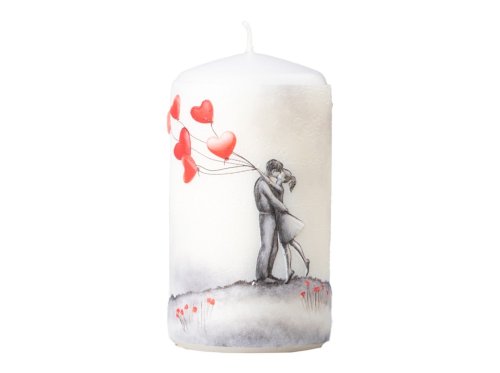 Romantická červená svíčka s motivem milenců a balonků, ideální pro Valentýn nebo jiné speciální chvíle.