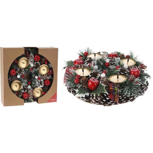Tento krásný adventní věnec se svícnem je ideální pro vytvoření sváteční atmosféry. Věnec má kulatý design s mrazivým vzhledem, zdobený šiškami a červenými detaily, což mu dodává tradiční vánoční vzhled. Zlatý svícen je navržen pro umístění čtyř svíček.