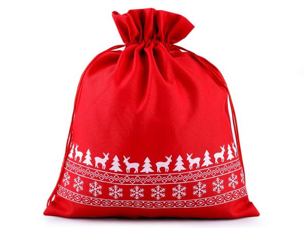 Pytlík s vánočními motivy se stahuje pomocí saténových šňůrek. Můžete ho použít na dárky nebo ho naplnit mikulášskou nadílkou. Dá se naaranžovat jako vánoční dekorace.