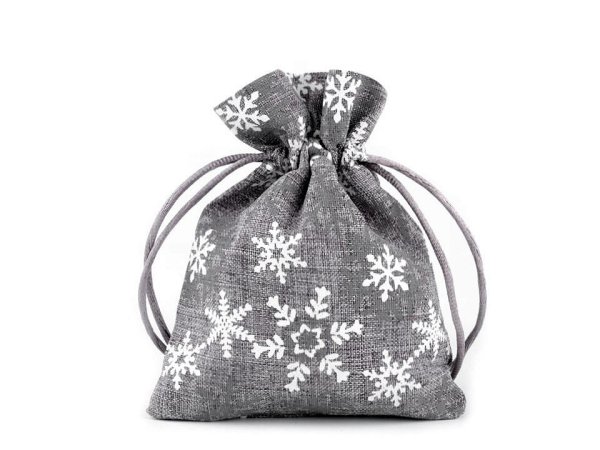 Malý dárkový pytlík zdobí potisk vloček. Snadno se uzavírá pomocí dvou stahovacích šňůrek. Je pevný. Můžete jej použít na zabalení drobných dárků, je krásný jako dekorace na Vánoce a využijete ho i na výrobu adventních kalendářů.