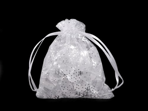 Dárkový pytlík zdobí metalický potisk vloček. Snadno jej uzavřete pomocí dvou stahovacích saténových šňůrek. Pytlík je skvělým pomocníkem při balení drobných dárků.