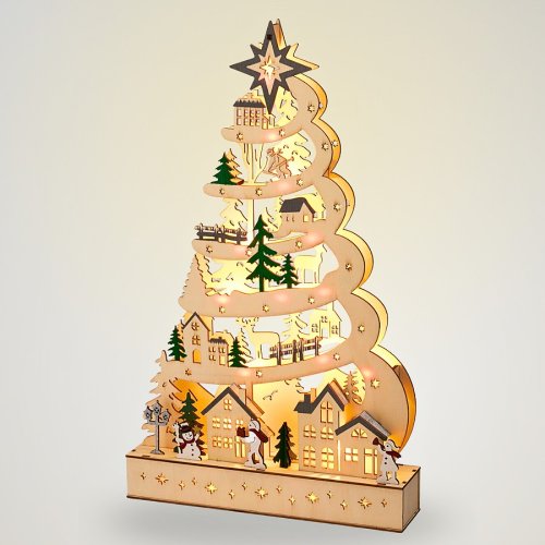 Dekorativní vánoční stromček v přírodní barvě s jemnými zelenými doplňky, osazený 15 teplými bílými LED diodami, ideální pro vytvoření sváteční atmosféry v menších prostorech či na stole.